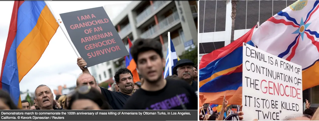 101 ஆண்டுகள் ஆகியுள்ள போதிலும் ஆர்மேனிய இனஅழிப்பை மறுத்து வரும் துருக்கி, படுகொலை செய்யப்பட்ட ஆர்மேனியர்களின் எண்ணிக்கையை வலுவாக குறைத்து காட்டுவதுடன், குறித்த மரணங்களுக்கு வேறு கற்பிதங்களைக் கூறிவருகிறது. ஆர்மேனியாவுக்கு அடுத்தபடியாக ஆர்மேனியர்கள் அதிகமாக வாழும் நாடு அமெரிக்கா. ஆதலாலேயே, இனஅழிப்புக்கு நீதி கேட்டும் ஆர்மேனியர்களின் போராட்டம் அமெரிக்காவில் அதிக கவனத்தை ஈர்ந்திருக்கிறது. இருப்பினும், இதனை முறியடிக்கும் நகர்வுகளில் துருக்கி தொடர்ச்சியாக ஈடுபட்டு வருகிறது. ஆர்மேனியர்களின் 101 ஆவது ஆண்டு நினைவுகூரலை அமெரிக்காவில் நீர்த்துப் போகச் செய்யும் முகமாக, துருக்கி அமெரிக்காவின் முக்கியமான நகரங்களிலும், முக்கியமான அமெரிக்க நாளேடுகளிலும் பெரும் பணச்செலவில் விளம்பரங்களை மேற்கொண்டது. ஆயினும், ஆர்மேனியர்கள் மனம்தளரவில்லை. அவர்களின் எதிர்ப்பையடுத்து கணிசமான நகரங்களில் குறித்த விளம்பர பலகைகள் அகற்றப்பட்டது.