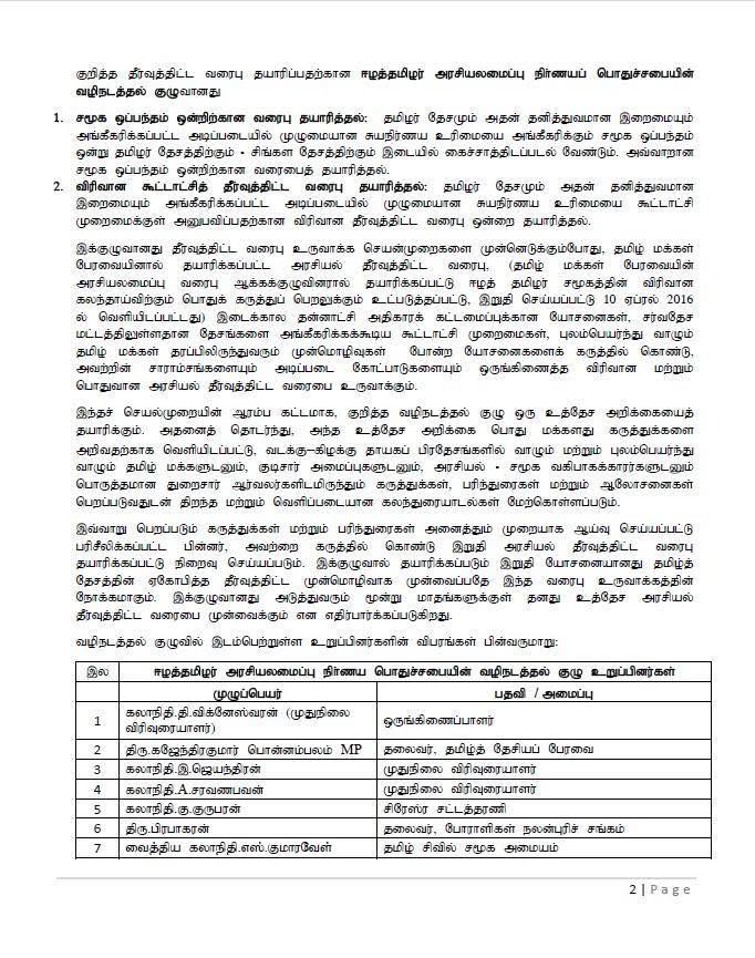 அதன்படி, அரசாங்கத்திற்கும் சர்வதேச சமூகத்திற்கும் ஈழத்தமிழர்களின் ஒருங்கிணைந்த பொதுவான நிலைப்பாட்டை முறையாக முன்வைக்கும் நோக்கில் இந்த 28 பேர் கொண்ட வழிநடத்தல் குழு அமைக்கப்பட்டுள்ளது.