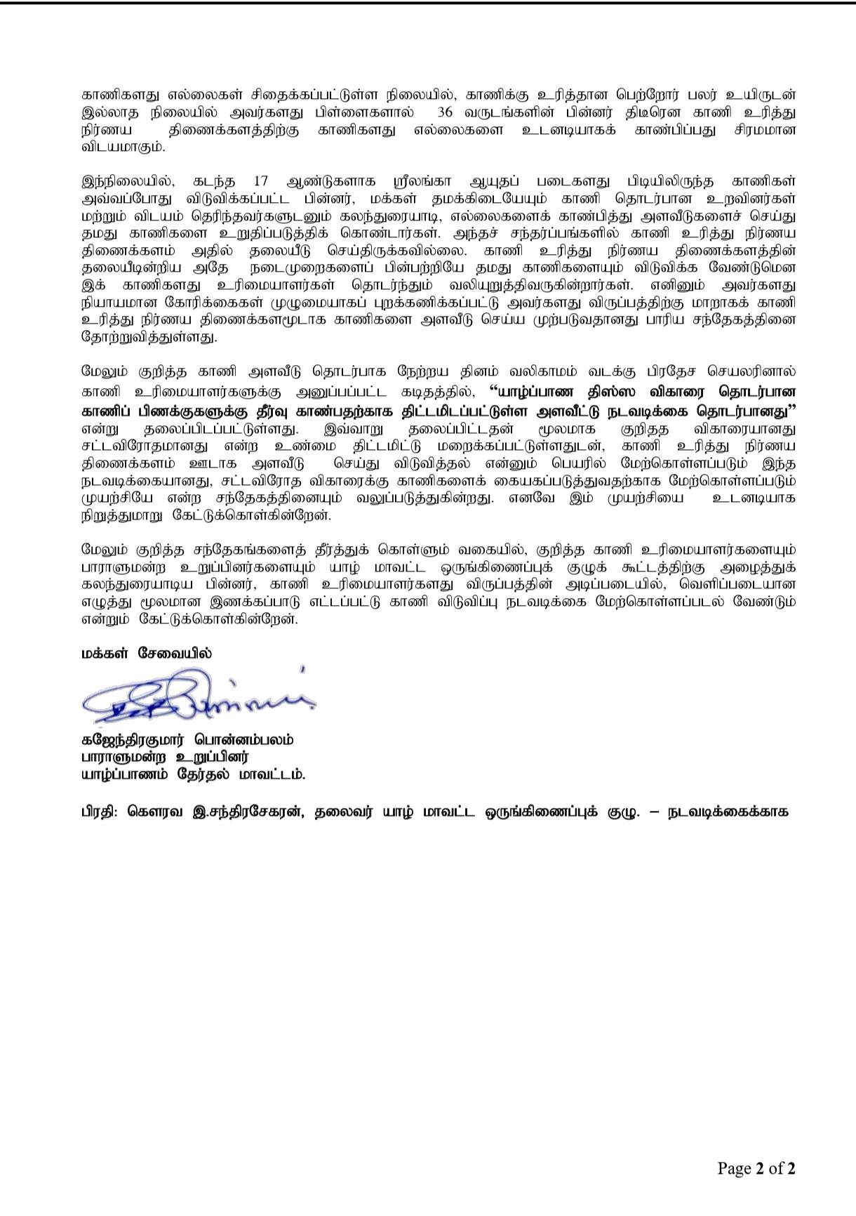 ஒருங்கிணைப்புக் குழுக் கூட்டத்தில் விவாதிக்கக் கோரிக்கை: காணிகளை விடுவிப்பதற்கான முறையான நடைமுறைகளைப் பின்பற்றாமல் முன்னெடுக்கப்படும் இந்தச் செயற்பாட்டை உடனடியாக நிறுத்த வேண்டும். இது தொடர்பாக நில உரிமையாளர்கள் மற்றும் நாடாளுமன்ற உறுப்பினர்களை யாழ். மாவட்ட ஒருங்கிணைப்புக் குழுக் கூட்டத்திற்கு அழைத்து விரிவாகக் கலந்துரையாடிய பின்னரே அடுத்தகட்ட நடவடிக்கை எடுக்கப்பட வேண்டும் என அவர் தனது கடிதத்தில் வலியுறுத்தியுள்ளார்.